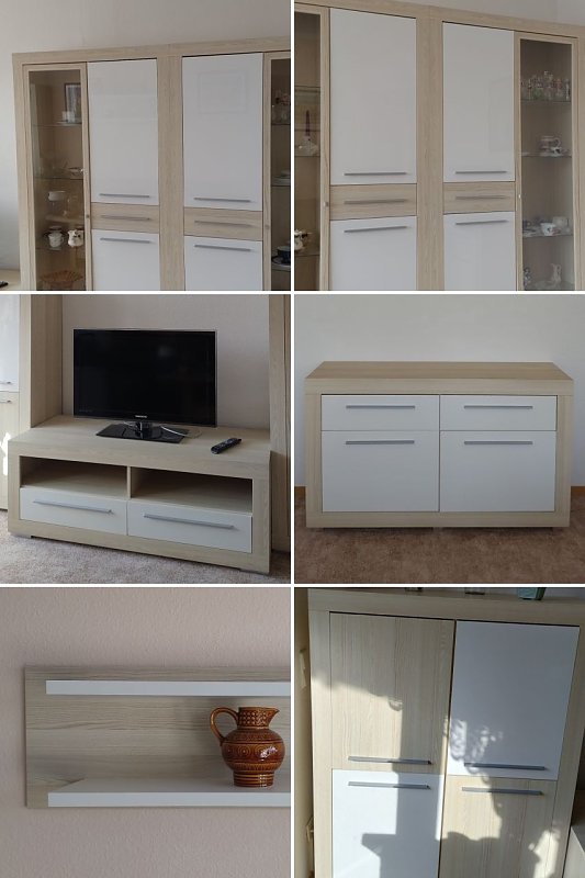 Neuwertige sehr gepflegte Wohnzimmermöbel abzugeben.Alle Couchteile sind ausklappbar.Besteht aus Dreisitzer , Zweisitzer und Sessel.Die Wohnlandschaft besteht aus einem Großen Schrank ein kleinerer ,ein TV Schrank und eine Kommode.Ein Couchtisch gehört ebenfalls dazu.Preis VB