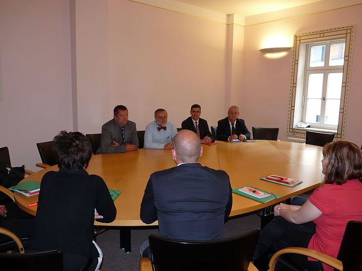 Der Begrüßung durch den Landrat (2. von li.) folgte ein zwangloses Gespräch, dass im kleinen Sitzungszimmer zusammen mit dem Pressereferenten des Landrates Dr. Heinz-Ulrich Thiele (re.), dem Leiter des Zentralamtes Volker Stietzel (li) und Ausbildungsleiter Frank Etzel (2. von re.) durchgeführt wurde. Hengstermann gab auch schon mal einen Ausblick, was denn die Auszubildenden so in nächster Zeit erwartet.