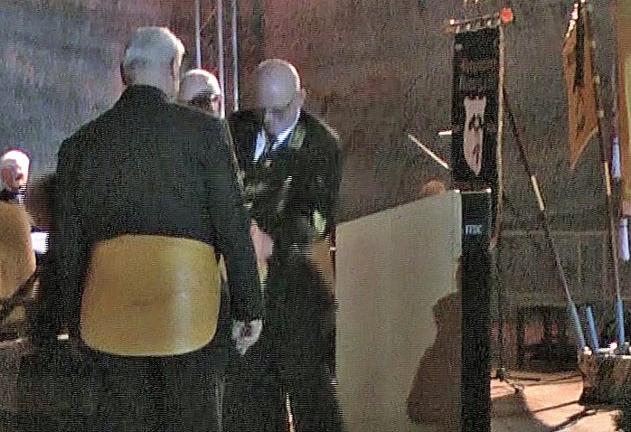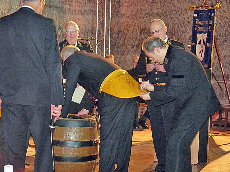 Aber Umweltminister Jürgen Reinholz wird keine Anzeige erstatten, wie er versicherte, obwohl von allen die Unterschrift vorliegt. Schließlich handelte es sich ja nur um den Knappenschlag, sonst hätte der Minister hinterher sich nicht so freudig der Kamera von kn gestellt. Der Knappenschlag ist Teil des Rituals, damit man die ehrenvolle Überreichung eines Arschleders des Bergmannsvereins Sondershausen bekommt.