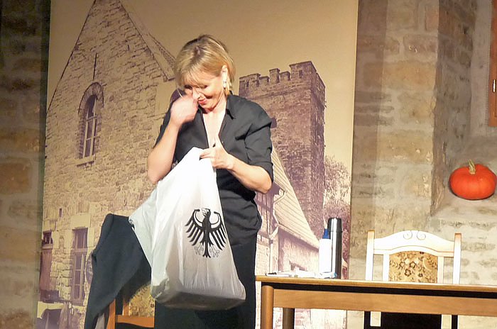 Witzig, politisch, und frech stellt die in Gera geborene Simone Solga ihr nun schon viertes Kabarett-Programm. Hier präsentiert sie die Handtasche der Kanzlerin mit dem Spruch: schwarz wie ihre Gesinnung. Und aktuell ist sie, den auch der Papstbesuch war Thema. Wenn man Solga glauben darf, dann will der Papst im Bundestag reden. Er will dort sein, wo das Elend am größten ist.