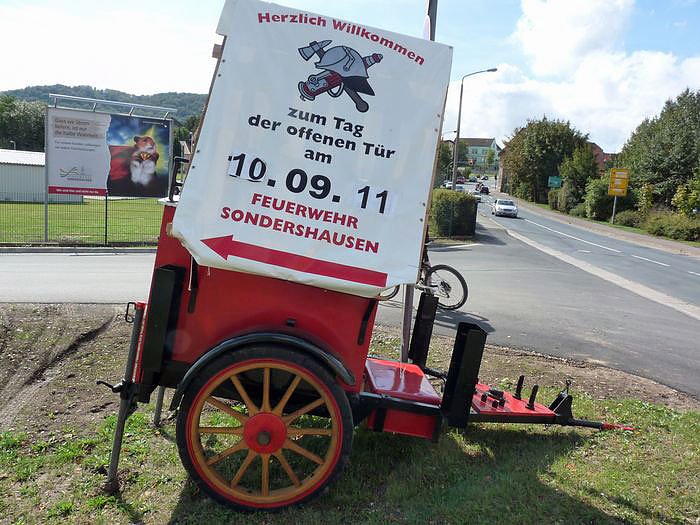 Die Werbung an der Straße war kaum zu übersehen. Und es kamen auch zahlreiche Besucher, obwohl es auch schon voller war. Wahrscheinlich lag es an dem besonders schwülen Wetter am gestrigen Nachmittag. Viele trotzdem gekommene Besucher flüchteten sich auf die Bänke, die in den Hallen der Feuerwehr standen, um wenigsten der Sonne zu entgehen.