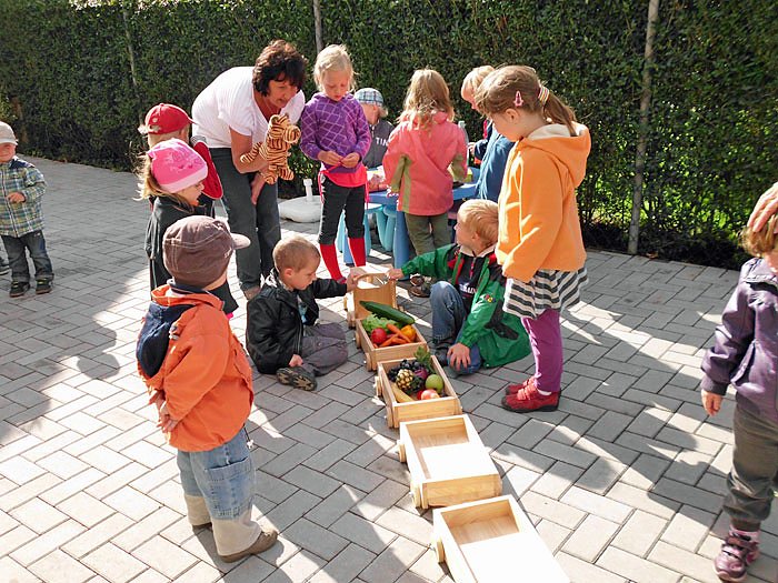 Essen 1st Erfahrungssache. Deshalb entdecken unsere Kinder die verschiedenen Lebensmittel mit Hilfe der Tiger-Handpuppe und der "Kleinen Lok, die alles weiß". Dadurch erfahren sie, wie gut ausgewogenes, frisches Essen schmeckt. Unsere Kinder erhalten jederzeit gesunde Durstlöscher und frisches Obst und Gemüse. Ihren natürlichen Drang nach Toben, Klettern und Spielen können sie täglich mindestens eine Stunde ausleben und lernen neue Bewegungsspiele kennen. Unsere Eltern erhalten regelmäßig Infos durch Elternabende, Newsletter und Tipp-Cards.