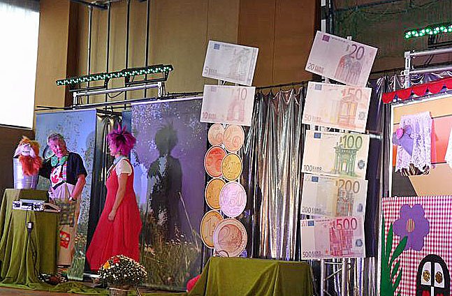 In einer spielerischen Weise sollen die Kinder etwas über Geld und den Umgang mit Geld vermittelt bekommen. So stellte Eurosita die Sparmaus (im Häuschen) dem Clown Hajo die Geldscheine vor, unterstützt von Lucie Luft..