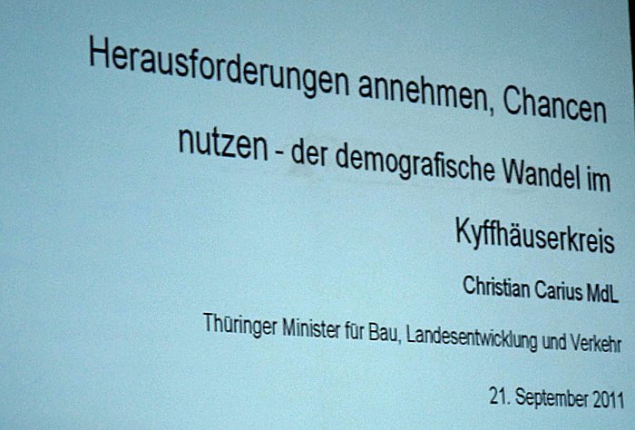Die Erwartungen an den gestrigen Auftritt von Minister Christian Carius (CDU) zum Thema demografischer Wandel im Kyffhäuserkreis waren hoch, genau wie der Andrang, so das Bürgermeister Joachim Kreyer als Hausherr in seinem Carl-Schroeder-Saal von Sondershausen erst mal Stühle schleppen musste...