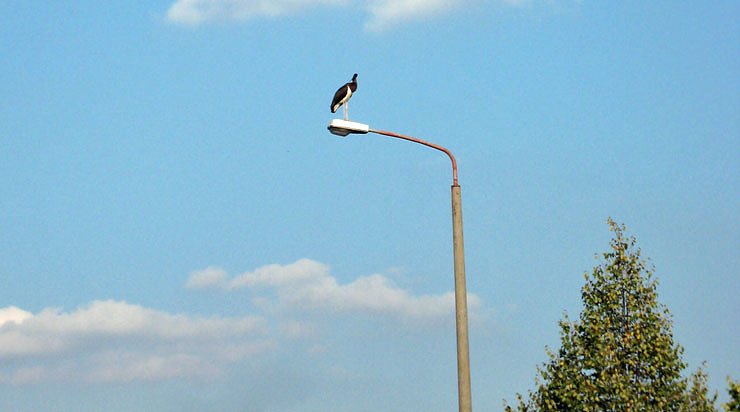 Richtig, ein scheinbar kopfloser Storch, vermutlich ein Schwarzstorch. Außerdem scheint er auch noch ein grünes Bein zu haben. Hat wohl bei der Kälte schon eine Socke übergestreift. Ist bestimmt ein Jungstorch, der etwas die Orientierung verloren hat.