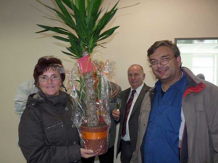 Heute gab es erst mal eine große Blume für die stellvertretende Schulleiterin, Hannelore Mottok, weil es doch mit der Sanierung der Schule weiter voran geht. Zurzeit müssen sich Schülerschaft und Lehrkörper mit einer Behelfsunterbringung vorlieb nehmen.