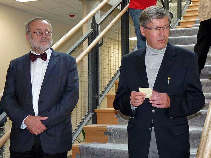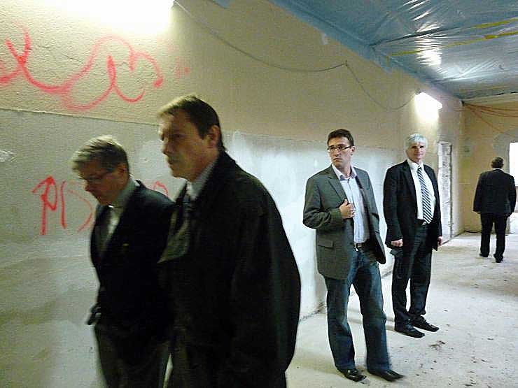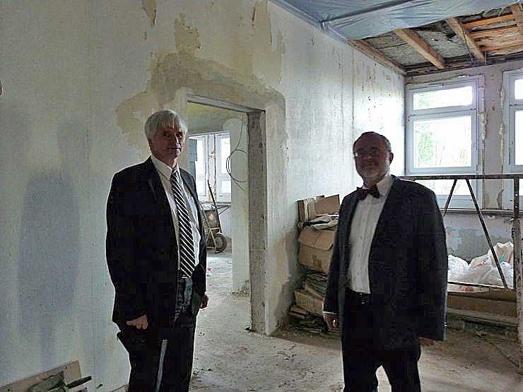 Landrat Hengstermann (li.) und Roßlebens Bürgermeister Rainer Heuchel (SPD) zeigten sich zufrieden, dass der Bau gut voran schreitet. Hengstermann dankte der Stadt Roßleben und der Gemeinde Mönchpfiffel, dass sie ihre Mittel aus dem Konjunkturpaket II für diese Sanierung bereitgestellt haben. Heuchel freut sich, dass diese Schule bald eine grüne Schule sein wird, nicht etwa wegen der schon grüngestrichenen Türen, auch nicht wegen der politischen Farbe Grün, sondern weil die Schule auch energetisch saniert sein wird, was natürlich der Umwelt hilft.