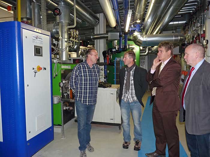 Der Betriebsleiter Bäder, Dieter Blumentritt (li) erläutert in einem Gespräch mit Axel Konschack von der Projektgesellschaft Energiesysteme mbH Nordhausen, und dem 1. und 2. Bürgermeister Matthias Strejc und Dr. Andreas Räuber (beide SPD) die Vorteile für die Therme.