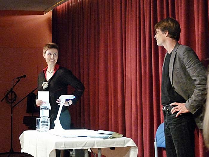 Dorothea Krimm, Dramaturgin für Konzert und Musiktheater, am Theater in Nordhausen begrüßte die Besucher und den Schriftsteller Markus Imbsweiler. Der 1967 geborene Imbsweiler ist zwar durch einige Kriminalliteratur bekannt geworden, aber mit Frontsignale. Komponieren in Zeiten des Krieges hatte er sich aber auch schon der Musik zugewandt.