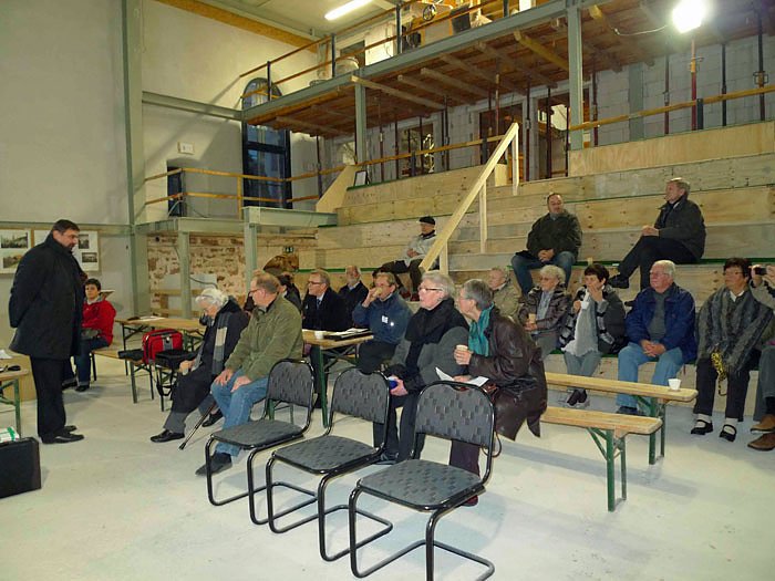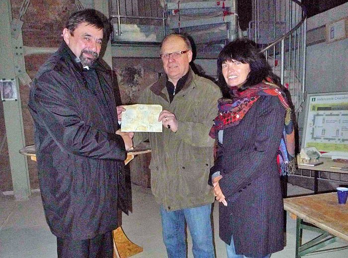 Trotz eisiger Temperaturen und Baustellenflair wagte man sich in den neu entstehenden Bürgersaal der Cruciskirche. Zwei Gasheizer und Glühwein konnten die Kälte nur symbolisch vertreiben, so dass man sich mit Rechenschaftsbericht, Gruß- und Dankesworten, Auszeichnungen und Wahl des neuen Vorstandes kurz fassen musste. Herr Kreyer und Frau Kraffzick dankten Herrn Wytrickus und seinen fleißigen Mitstreitern mit Geschenken für das wieder großartige Ergebnis der geleisteten ehrenamtlichen Tätigkeit bei der Schaffung des Bürgerzentrums Cruciskirche.