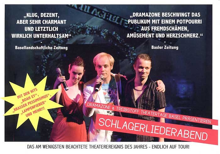 Nach der erfolgreichen Uraufführung der Performance Schlagerliederabend in Basel (Schweiz) kehrt das Projekt nun nach Deutschland und vor allem in die Heimatstadt von Dramazone zurück. Der Theaterabend entstand in Koproduktion mit den Treibstoff Theatertagen Basel und wurde dort aus über 100 Einsendungen als eine der sieben Koproduktionen ausgewählt. Nach der Frankenhäuser Aufführung wird das Stück unter anderem in Hamburg zu sehen sein.