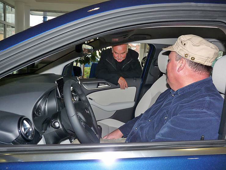 Da setzten sich die die potentiellen Kunden schon mal ins Auto, wie hier und fachsimpelten untereinander. Oder man ließ sich die Fahrzeuge von einem der Fachberater erklären oder startete gar eine Probefahrt. Ob kn auch einen Favoriten hatte? Klar, den B180 CDI BE mit 108 PS bei 1.796 cm3 und einem Kombiverbrauch von nur 4,4 Liter auf 100 Kilometer.