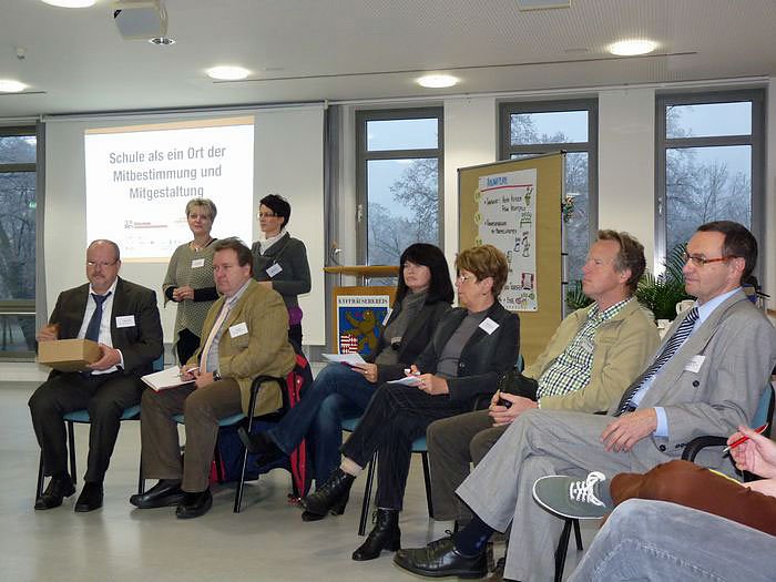 Am 16. November 2011 fand schließlich die öffentliche Diskussion zum Modellvorhaben im Landratsamt Kyffhäuserkreis statt. Unter den Fragestellungen Was geht?, Wie geht’s? und Was geht nicht? diskutierten die Klassensprecher/innen, Pädagog/innen sowie geladene Gäste und Interessierte, wie Demokratieerziehung in den Schulen gelebt wird. Die Veranstaltung eröffnete der Leiter des Schulamtes, Rüdiger Kessler, sowie die Vorsitzende des Jugendhilfeausschusses des Kyffhäuserkreises und 1. Beigeordnete der Stadt Sondershausen, Cornelia Kraffzick. Herr Kessler betonte in seinem Grußwort, dass es wichtig ist, in der Schule über Demokratie zu sprechen. Dabei sollten aber nicht nur die Schüler und Lehrer diskutieren, vielmehr sollte es gelingen, auch die Familien mit einzubeziehen. Herr Kessler äußerte den Wunsch, dass noch weitere Schulen in das Modellprojekt einbezogen werden sollen. Frau Kraffzick forderte die Kinder und Jugendlichen auf, sich aktiv an Gestaltung ihrer Schule zu beteiligen. Dabei sollen die Schüler mit den Lehrern reden und nicht über sie.