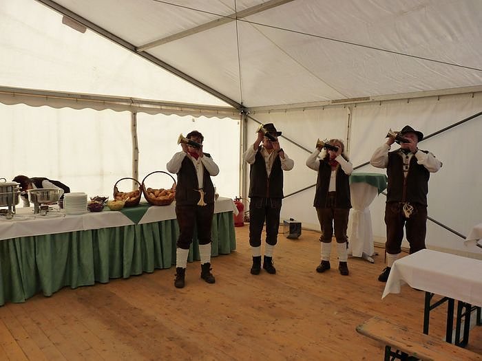 Zu jeder Einweihungsfeier gehört eine musikalische Umrahmung. Zur Einleitung und hier im Bild zur Freigabe des in dem Falle warmen Büffets blies die Jagdhornbläsergruppe "Die Wilderer" der Jägerschaft Kyffhäuser, Mönchpfiffel.