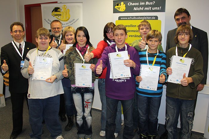 Dank der Unterstützung der Kyffhäusersparkasse und der HTI Hoch-, Tief- und Industriebau GmbH Greußen, sowie der Kreisverwaltung des Kyffhäuserkreises, konnten von den 14 gestarteten Schülerinnen und Schülern der beiden Regelschulen in Sondershausen, des Förderzentrums Sondershausen und des Greußener Gymnasiums, zehn Jugendliche bei der Abschlussprüfung zeigen, ob sie als Schulbusbegleiter die an sie gestellten Anforderungen erfüllen können. Von diesen Schülerinnen und Schülern haben acht die Ausbildung erfolgreich beendet und erhielten dafür vom Landrat des Kyffhäuserkreises, Peter Hengstermann, und dem Bürgermeister der Stadt Sondershausen, Joachim Kreyer die Ausweise und Teilnahmezertifikate überreicht.