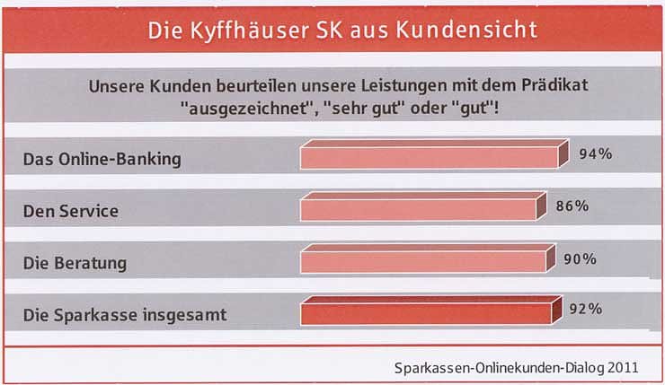 Autor: khhUnd in der Tat, für 65 Prozent der Menschen im Kyffhäuserkreis und für 49 Prozent der Firmen im Kyffhäuserkreis ist die Kyffhäusersparkasse die "Nummer l" bei allen Bankangelegenheiten. Diese hohe Kundenzufriedenheit spiegelt sich auch in solchen Zahlen wieder, wie "88 Prozent unserer Kunden empfehlen uns gern weiter", so Ulrich Heilmann gegenüber kn, und "89 Prozent unserer Kunden würden sich wieder für die Kyffhäusersparkasse entscheiden". Die Freude darüber im Jubiläumsjahr des 175-jährigen Bestehens der Kyffhäusersparkasse ist nicht unberechtigt.