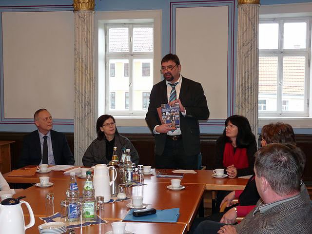 Dr. Frank Giesel, Dr. Christina Kindervater, Bürgermeister Joachim Kreyer (CDU) und die 1. Beigeordnete des Bürgermeisters Cornelia Kraffzick (SPD) bei der Übergabe von Büchern über Sondershausen an die beiden Gäste.