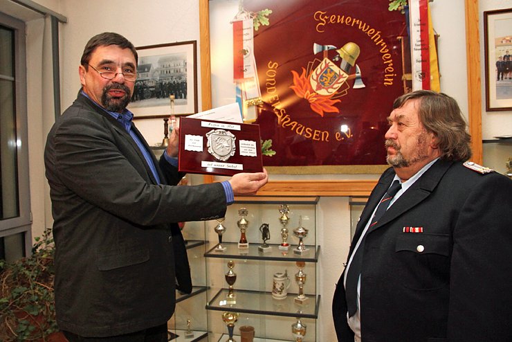 Der Kamerad Joachim Olms wurde vom Bürgermeister Kreyer mit einer Ehrentafel aus der Einsatzabteilung verabschiedet.