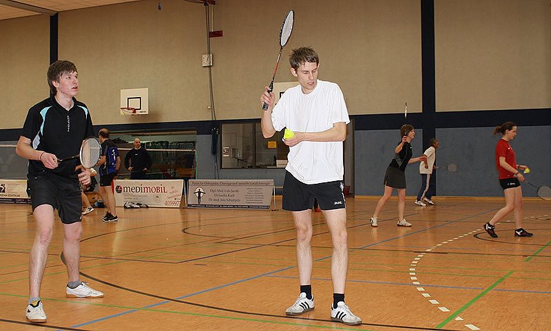 Die Kurstädter, die erstmals in Bestbesetzung antreten konnten, fegten die Landeshauptstädter vom ESV Lok Erfurt 4 mit 6:0 förmlich vom Spielfeld. Alle Mannschaftsmitglieder konnten in dieser Partie überzeugen und keines der sechs Matches musste in einen Entscheidungssatz. Nach anderthalb Stunden Pause ging es dann gegen die Gastgeber vom 1. BC Mühlhausen 3. Hier wurde es enger. Während das umgestellte Herrendoppel mit Dennis Weber und Steve Nixdorf (Foto oben) nach zwei Sätzen über den Sieg jubeln konnten, erlebten die Mädels, die zeitgleich auf dem Nachbarfeld spielten ein Herzschlagfinale im Ersten Satz. Nach 20:20 wechselte die Führung immer wieder.