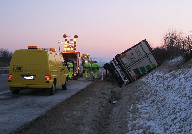 Ein 56-jähriger LKW-Fahrer verlor nach eigenen Angaben aufgrund eines Sekundenschlafes die Kontrolle über seine voll beladene Zugmaschine. Zwischen den Anschlussstellen Leinefelde und Breitenworbis in Fahrtrichtung Leipzig kam der Brummi-Fahrer von der Fahrbahn ab. Sein Anhänger, beladen mit mehr als 16 Tonnen Obst und Gemüse, kippte um und blieb im Straßengraben liegen. Der Fahrer wurde zum Glück nur leicht verletzt.