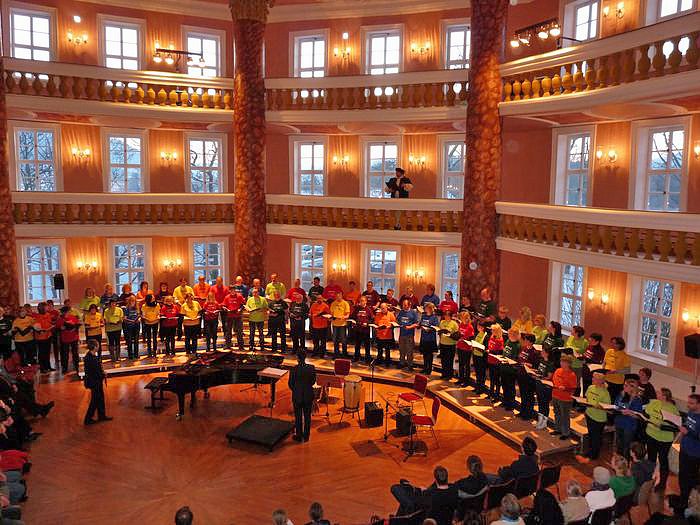 Die Ergebnisse dieses Workshops wurden gestern in einem öffentlichen Konzert im Achteckhaus unter der musikalischen Leitung von Prof. André Schmidt präsentiert. Stilistisch wurde das Programm so gestaltet, dass es vom 16. Jahrhundert bis in die heutige Popmusik reichte und auch weltliche Chorwerke a cappella und mit Klavier- oder Bandbegleitung beinhaltete.
