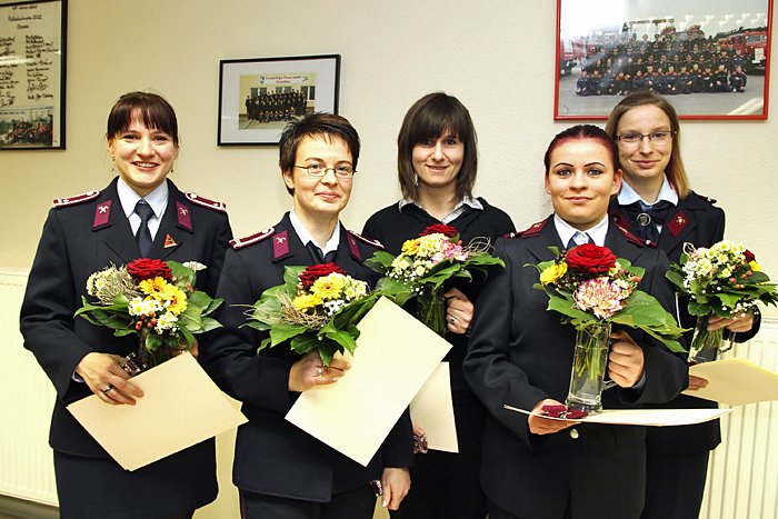 Beförderung zur Löschmeisterin, Manuela Hasenbein, zur Hauptfeuerwehrfrau, Judith Klein, Annett Wallrodt und zur Feuerwehrfrau, Melanie Hocke-Klebba, Diana Schumann.