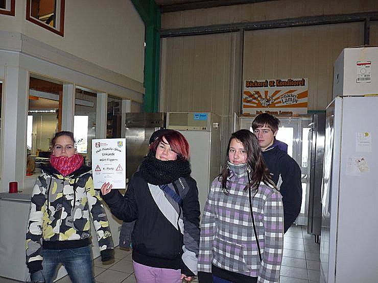 Für die MGH-Flippers aus dem Jugendclub Rossleben hatte Katharina Töppe (li.) eine Überaschung organisiert, über die sich auch die Leiterin des Mehrgenerationenhauses, Susanne Kammloth, mitfreute. Es gab einen Gutschein für einen Eisbecher für 7 Personen gespendet von der in Roßleben ansässigen Firma Bäckerei Lampe. In der Produktionsstätte der Bäckerei Lampe übergaben Katja und André Lampe (re.) die Gutscheine.