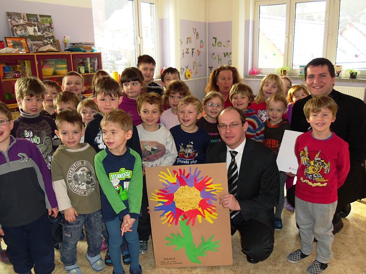 René Jacob und David Barth von der Kyffhäusersparkasse besuchten die Rasselbande und hatten einen Scheck in Höhe von 300 Euro dabei. Die Kinder waren gespannt und lauschten den Worten von Frau Henschel. Auf die Frage "was es denn in der Sparkasse gibt", antworteten die Kinder mit "Geld". "Und was macht man mit dem Geld?" - "Essen kaufen", sagte eines der Kinder. Genau dafür soll das Geld auch investiert werden. Denn Anlass für die Spende ist die Aktion "gesundes Frühstück", bei der einmal in der Woche ein gemeinsames Frühstück stattfindet. Und das nicht mit Nutella, Marmelade und Co.! Nur gesunde Sachen kommen auf den Tisch.