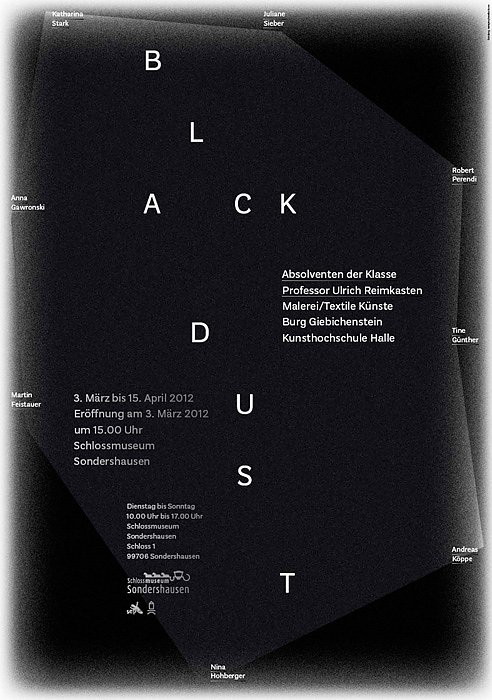 Das Schlossmuseum Sondershausen zeigt im März 2012 eine Ausstellung mit dem Titel BLACK DUST von Absolventen der Klasse Professor Ulrich Reimkasten, seit 1995 Professor an der Burg Giebichenstein Kunsthochschule Halle. Einzelheiten dazu und wann die Vernissage ist, erfahren Sie hier...