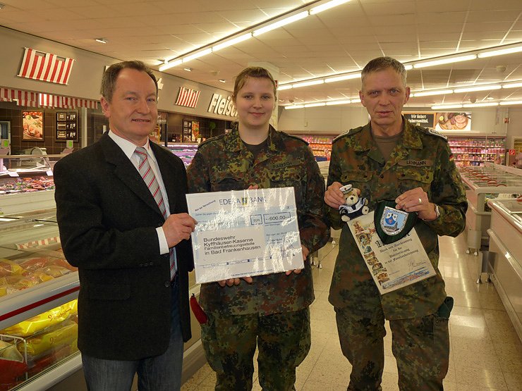Der Marktleiter des Herkules-Marktes (Edeka-Gruppe) von Bad Frankenhausen, Gunther Jaap, über gab an Oberstabsfeldwebel Bernd Lehmann und Stabsunteroffizier Kristin Paetsch einen Scheck in Höhe von 600 Euro. Mit dem Geld soll die wichtige Arbeit der Familienbetreuungsstelle unterstützt werden.
