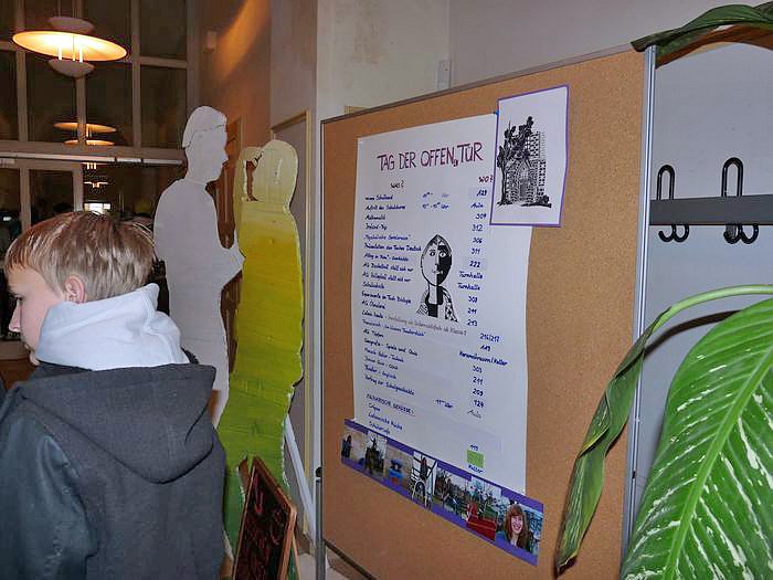 In der Zeit von 10:00 bis 12:00 Uhr hatte in die Räume des Gymnasiums viel Interessierte, Schüler, deren Eltern oder Großeltern vieles zu bieten. Erster Anlaufpunkt die große Informationstafel am Eingang. Schon ein kurzer Blick zeigt, hier wurde wieder jede Menge geboten