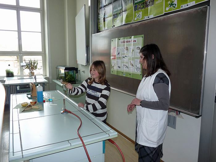 Die Besucher konnten sich nicht nur von den Räumlichkeiten in dem altehrwürdigen Gebäude beeindrucken lassen, sondern auch selbst feststellen, dass moderne Schulmittel zur Verfügung stehen, oder wie hier im Bild auch gleich mitmachen.