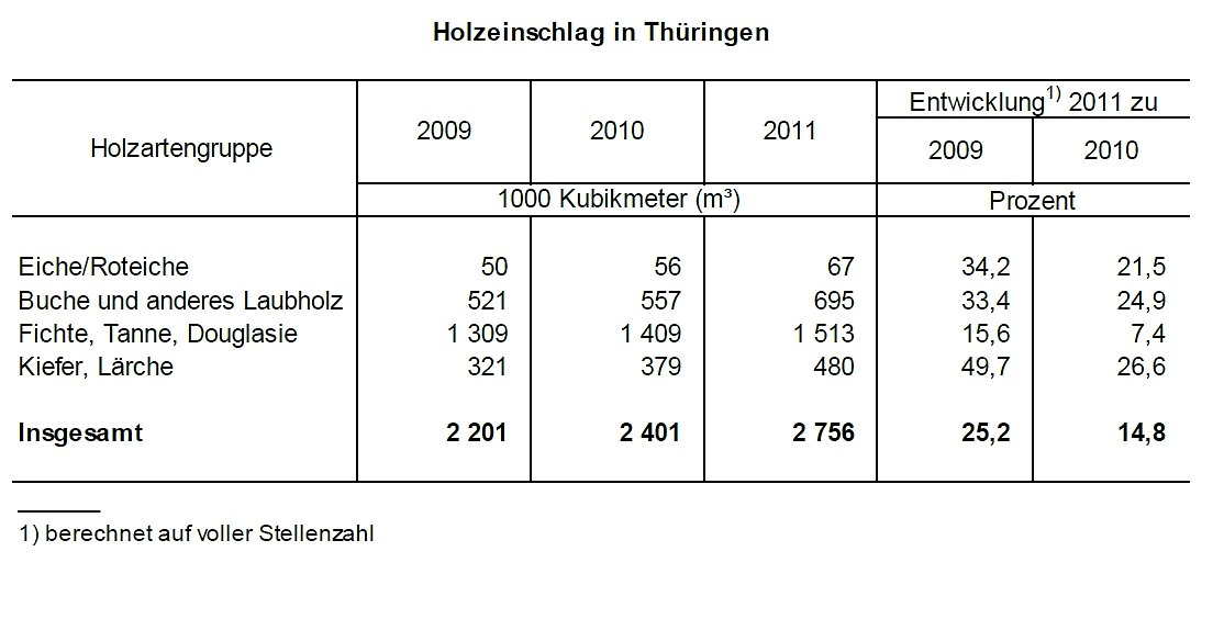 Im Jahr 2011 wurden in Thüringens Wäldern 2,8 Millionen Kubikmeter Holz eingeschlagen. Gegenüber 2010 wurden 15 Prozent bzw. 0,4 Millionen Kubikmeter und gegenüber 2009 sogar 25 Prozent bzw. 0,6 Millionen Kubikmeter mehr Holz geerntet...