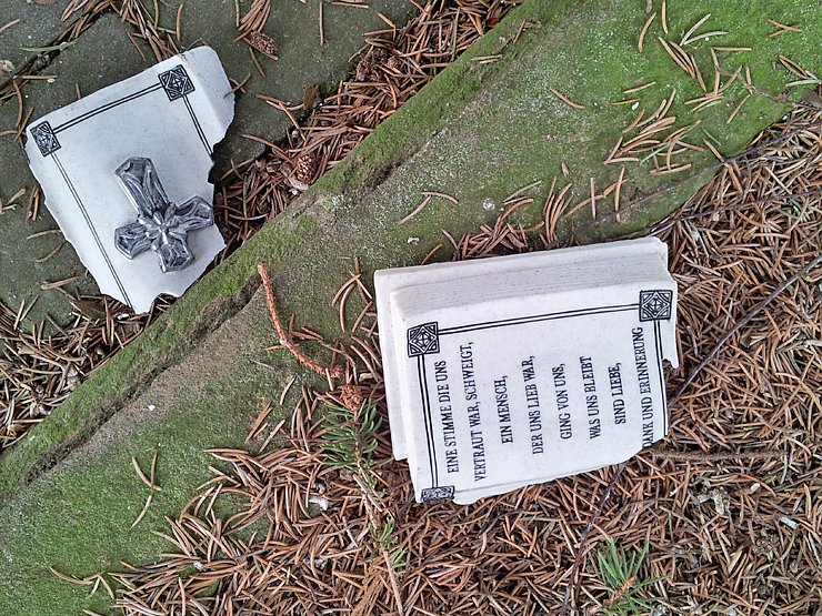 Daraufhin habe ich die Polizei informiert und Anzeigen wegen Störung der Totenruhe erstattet. Die Polizei kam dann gegen 9:30 Uhr vor Ort und hat die beschädigten Sachen sichergestellt und meine Anzeige aufgenommen.