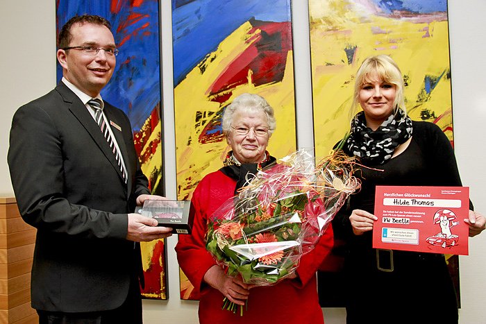 Autor: khhHilde Thomas aus Kleinbrüchter wurde am Donnerstag von ihrer Kundenberaterin Jessica Rosenstock und dem Geschäftsstellenleiter Steffen Pfeifer in die Filiale der Kyffhäusersparkasse nach Ebeleben eingeladen. Warum wusste sie bis dato nicht. Dann kam die große Überraschung - sie kann einen nigelnagelneuen VW Beetle ihr Eigen nennen.