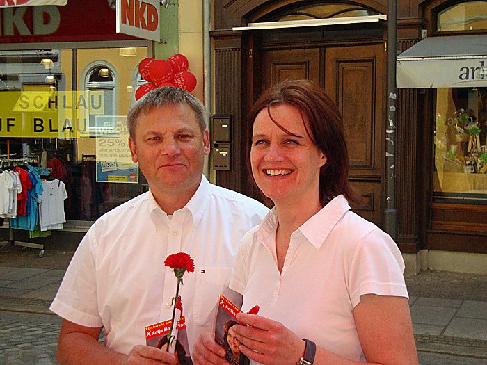 Dabei erhielt sie prominente Unterstützung aus der Landeshauptstadt Erfurt. Der wiedergewählte Oberbürgermeister Andreas Bausewein (SPD) und der Vorsitzende der SPD-Fraktion im Thüringer Landtag, Uwe Höhn (Bild unten), verteilten an der Seite von Antje Hochwind ebenfalls rote Nelken.