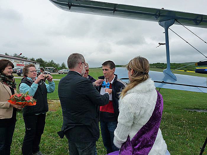 Pech allerdings für den Gewinner Udo Pötzschke aus Bad Frankenhausen, aber gebürtig in Heldrungen, wie er kn sagte. Wegen des schlechten Wetters blieb die Maschine am Boden. Horst Dreischärf, Erster Vorsitzender des Aeroclub "Hans Grade" Bad Frankenhausen e.V., sagte, bei 300 Meter Wolkenhöhe ist so gut wie nichts zu erkennen und der Kyffhäuser könnte wegen der Wolken nicht mal gesehen werden. In einer kleinen Regenpause nahm man aber vor der AN-2 wenigstens Aufstellung. Der bekannteste Flige-Träger des Kreis, Landrat Peter Hengstermann (CDU) richtete dem Gewinner nochmals die Fliege.