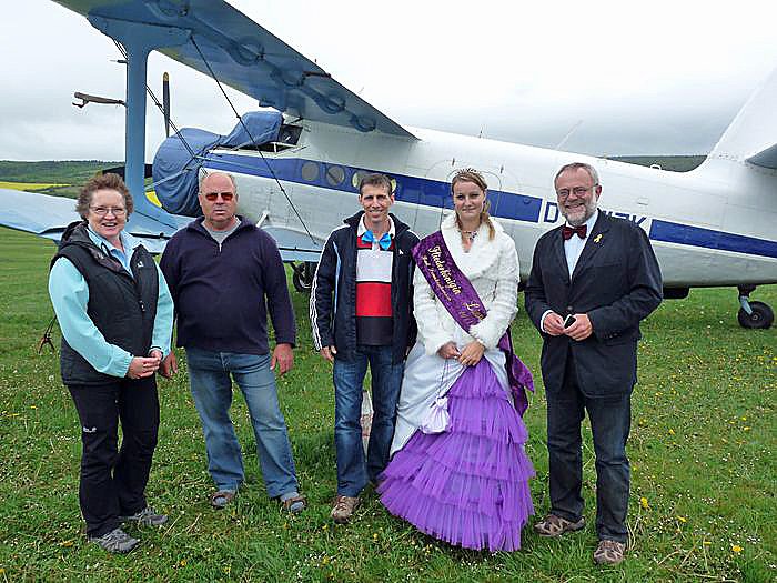 Wenn man nicht fliegen kann, dann wollte man wenigstens vor dem Flugzeug Aufstellung nehmen, dachten sich Marion Haas, Pressesprecherin des Aeroclub "Hans Grade" Bad Frankenhausen e.V., Horst Dreischärf, der Gewinner Udo Pötzschke, Fliederkönigin Linda I. und Landrat Peter Hengstermann. Der Flug soll bei schönem Wetter nachgeholt.