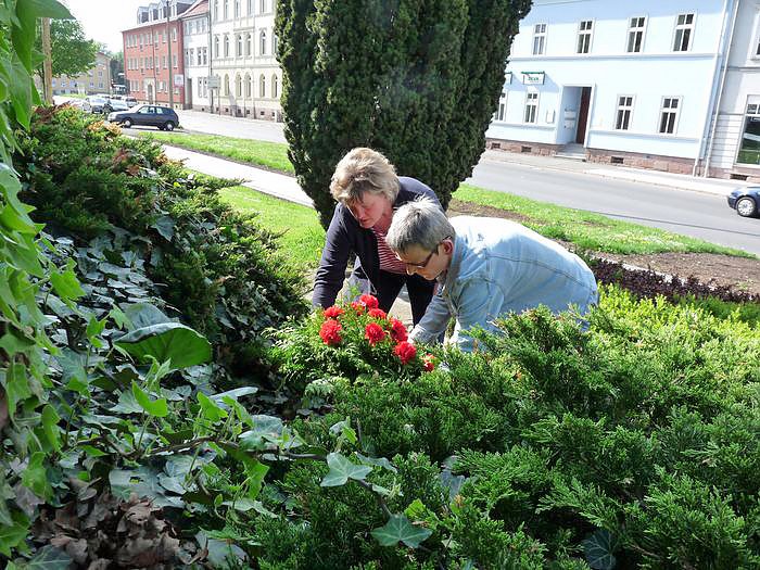 Beatrice Ritzke und Sigrid Rößner legten am Gedenkstein der Opfer des Faschismus vor dem Geschwister-Scholl-Gymnasiums ein Gebinde nieder.