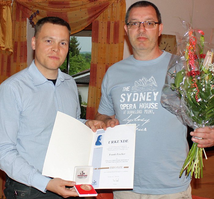 Der erkrankte Frank Fischer erhielt aus den Händen des Vorsitzenden der Thüringer Sportjugend Paul Wedeleit die die Johann Christoph Friedrich GutsMuths-Ehrenplakette in Bronze überreicht.