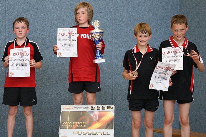 Florian spielte ein solides Halbfinale gegen Richard Mund aus Niederroßla. Er ließ beim 21:8 und 21:9 nicht wirklich viel zu und konnte zudem Kräfte fürs Finale sparen. In diesem traf er erwartungsgemäß auf Tom Kahlert aus Erfurt, mit dem er 3 Stunden zuvor Landesmeister im Doppel wurde. Es entwickelte sich ein ausgeglichenes Spiel. Schon im ersten Satz konnte Florian die Traineranweisungen nicht wie gewohnt umsetzen. Zu wenig Netzspiel, der schlagstarke Gegner wurde mit zu kurzen Clear`s stark gemacht. Dennoch 21:19 für den Frankenhäuser. Dem aggressiven Spiel des Erfurters hatte Florian im zweiten Satz nichts entgegen zu setzen – 10:21. Zu taktischen Fehlern kam Verkrampfung und Frust. Mitte des dritten Satzes das gleiche Bild. Erst nach 13:16 Rückstand besann sich die Frankenhäuser Nachwuchshoffnung auf eigene Stärken und die Umsetzung der Traineranweisungen. So spielte Florian endlich sein Spiel und versenkte Ball um Ball im Vorderfeld der Vorhandseite des Erfurters – 18:18. Die Frankenhäuser Vereinskammeraden und Eltern bejubelten jeden Punkt. Dann ein Smash ins Vorhandhalbfeld des Erfurters, die Zähltafel wurde umgehend auf 20:18 für Florian gedreht. Tom reklamierte AUS! Nach langem Hin und Her gab der Frankenhäuser nach und der Ballwechsel wurde wiederholt. - 19:19. Das Match wogte fortan hin und her. Schließlich schlug Florian nach 3 eigenen Matchbällen einen Clear zum Stand von 22:24 ins Aus. Eine bittere Niederlage, die man an diesem Tag mit der von Bayern München in der UEFA Champions League vergleichen könnte. Zumindest für den kleinen Flo, der fühlte sich wie Bastian Schweinsteiger.