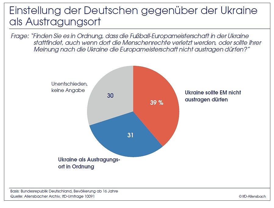 Bei aller Euphorie und Zuversicht sehen es viele Deutsche allerdings kritisch, dass die Fußball-Europameisterschaft trotz der dortigen Menschenrechtsverletzungen in der Ukraine stattfindet: 39 Prozent der Bevölkerung sind der Auffassung, dass die Europameisterschaft aufgrund der Menschenrechtsverletzungen nicht in der Ukraine ausgetragen werden dürfte.