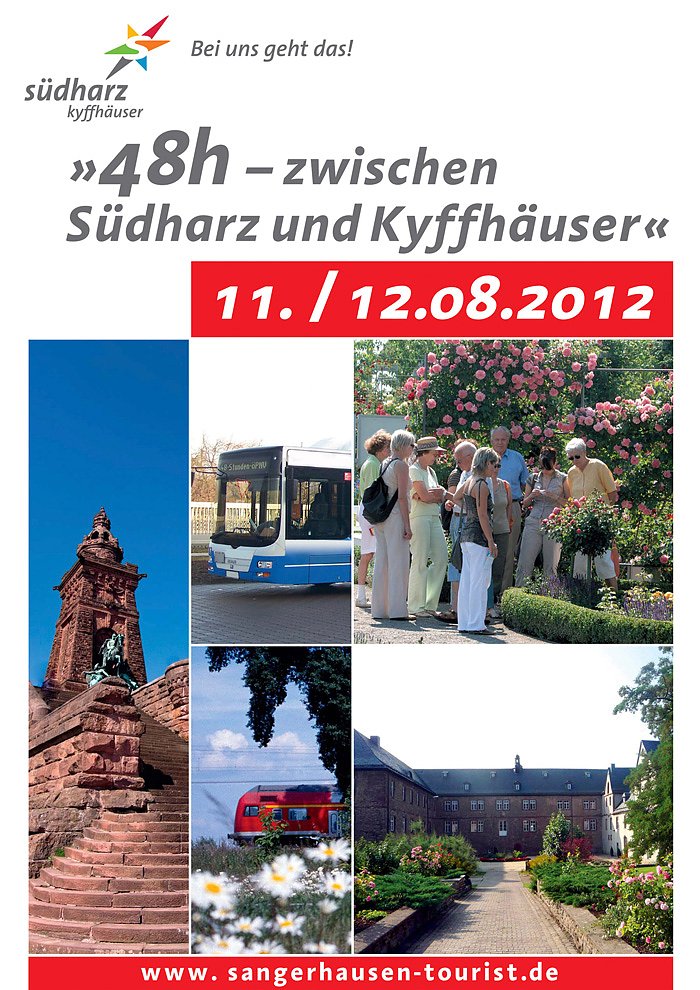 Die Region zwischen Südharz und Kyffhäuser können Sie auch außerhalb der 48 Stunden Tour mit dem Bus erreichen, nutzen Sie hierzu den Rufbus 504 - Kyffhäuserbus oder die Linie 461Kelbra-Badra-Sondershausen sowie der Linienbus 530 Sondershausen-Bad Frankenhausen-Artern.