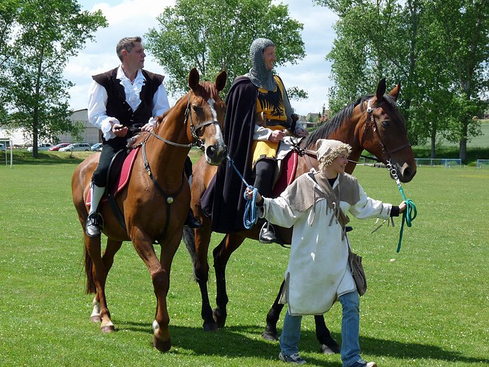 Wie der zu krönende Laubkönig den Festplatz des 17. Lindenblütenfestes der Neuzeit erreichen würde, war bald geklärt. Hoch zu Ross kam der zukünftige Laubkönig, begleitet von Ritter "Gerwig von Kyffhausen".