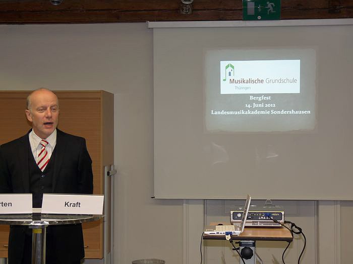 Vor knapp einem Jahr hatte man im Oktober in Sondershausen an gleicher Stätte den Startschuss gegeben. Staatssekretär Prof. Dr. Roland Merten sprach heute das Grußwort anlässlich des Bergfestes zum Ende des 1. Projektjahres im Schulentwicklungsprojekt Musikalische Grundschule. Er danke der Bertelsmann-Stiftung die mit großer Unterstützung nicht nur Thüringen in diesem Punkt unterstützt, sondern auch andere Bundesländer wie demnächst Bayern.