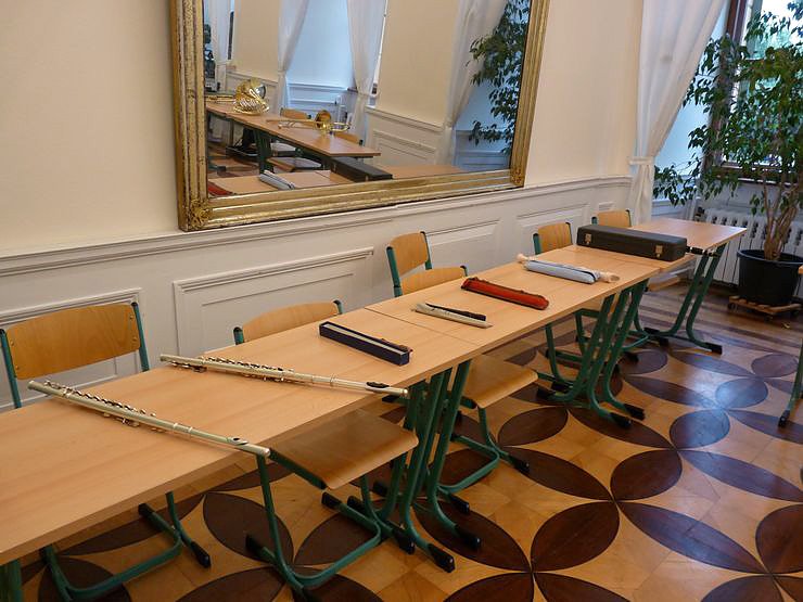 Autor: khhDie hier noch schön aufgereihte Musikinstrumente konnte kn noch in aller Ruhe fotografieren. Aber bald sollte in den Räumen der Musikschule Sondershausen ein kommen und gehen vorherrschen.