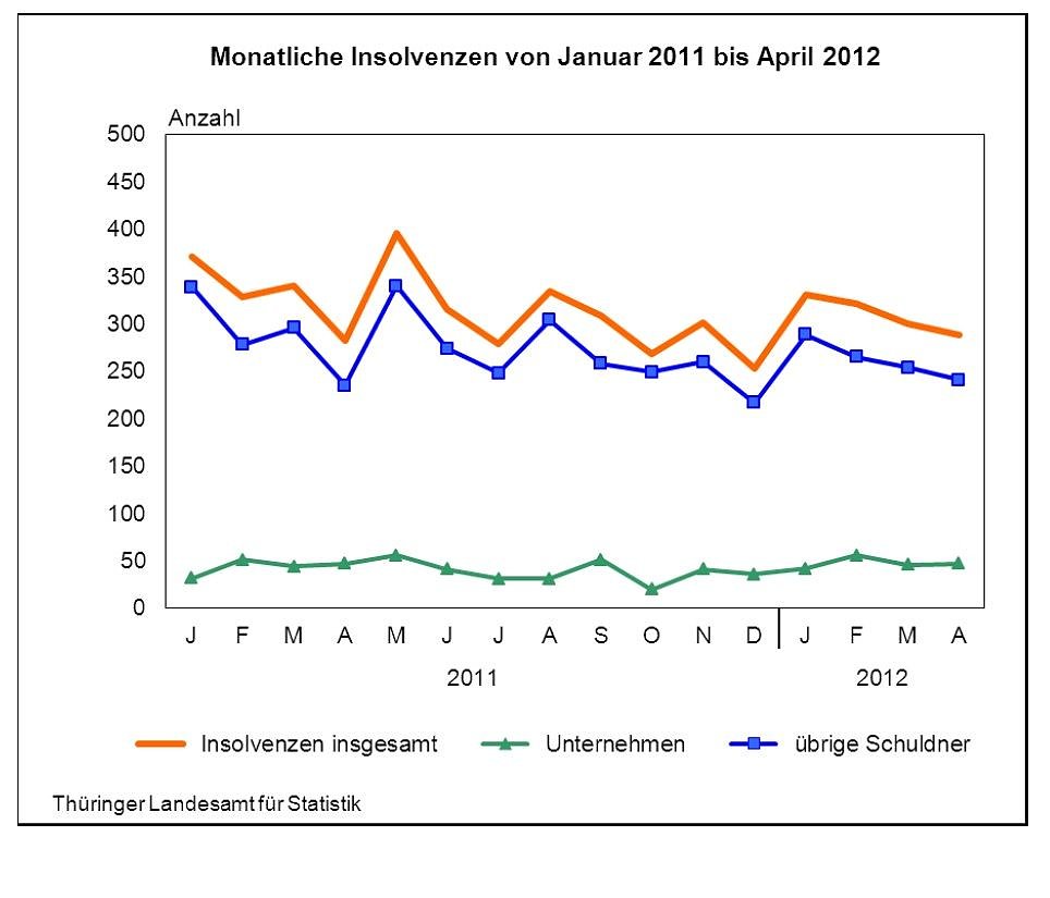 Die Thüringer Amtsgerichte entschieden von Januar bis April 2012 über 1 240 Insolvenzverfahren. Davon entfielen 15,4 Prozent auf Unternehmen und 84,6 Prozent auf übrige Schuldner. Das sind natürliche Personen als Gesellschafter, ehemals selbständig Tätige, private Verbraucher und Nachlässe...