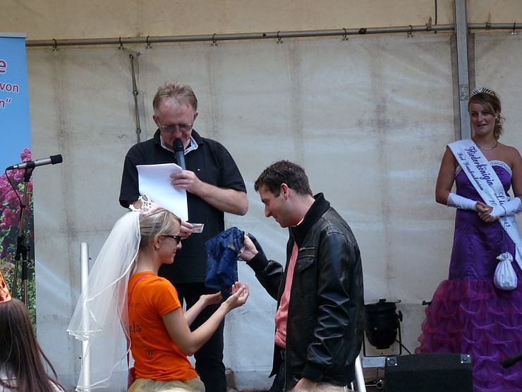 In die Verlosung schaltete sich auch noch ein Jungesellinnenabschied ein. Man wollte unbedingt mit Fliederkönigin Linda I. und der Apfelschnäpper auf einer Bühne stehe. Und man spendierte ein Seidentuch, dass sich der Kurdirektor mit 30 Euro und einem Kuss ersteigerte. Das Beweisfoto für den Kuss ist in der Bildergalerie.