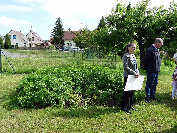 Bevor man sich im Garten vom Wachstum der von den Kindern selbst gelegten Kartoffeln überzeugte, dankte Wolfgang Dittrich den Stadtwerken für die Unterstützung. Der Scheck über 400 Euro war quasi der letzte Baustein um die Hütte für die Kinder bauen zu können. Natürlich hatten sich auch die Kinder mit einem Lied bedankt. Einig war man sich, dass es auch ein Einweihungsfest geben wird, vielleicht auch ein Richtfest. Damit nimmt das Projekt des Patengartens, einzig im Kyffhäuserkreis, einen sehr guten Verlauf, so Dittrich gegenüber kn.