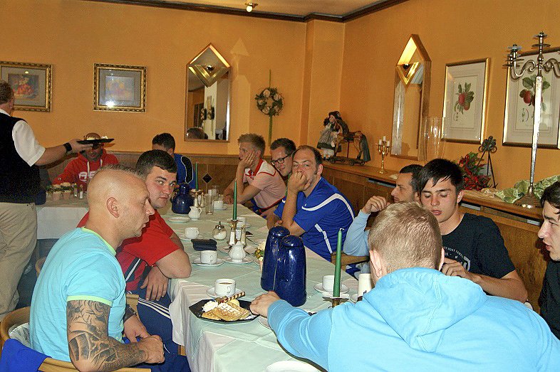 Am nächsten Morgen präsentierten sich dennoch alle Mitglieder der "Reisegruppe Blau-Weiß" pünktlich zum gemeinschaftlichen Frühstück und der darauf folgenden Trainingseinheit auf dem Rasenplatz, ehe es am Nachmittag nach präsidialer Ansprache durch den Vereinsvorsitzenden Achim Ritter bei Kaffee & Kuchen ins nahegelegene Waldbad ging. Dort angekommen ließen sich die Frankenhäuser auch nicht von den aufkommenden Wolken und dem dazugehörigen Regen die Laune vermiesen, sondern tobten sich beim Beachvolleyball, beim Kleinfeldfußball und im Schwimmbecken aus.